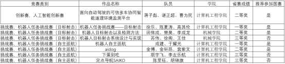 、机械工程学院在机器人任务挑战赛、人工智能创新赛中共获省级一等奖2项、二等奖3项、三等奖3项。获得一等奖、二等奖的五支团队晋级全国总决赛。
