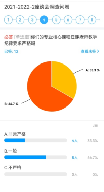 院长杭波、副书记李小华、系主任胡春阳、党支部书记程虹、班主任黄金洲、刘雨潇、辅导员秦文杰以及计科专业2019级、2020级学生、2021级专升本学生代表,会议由支部书记程虹主持。为了更好的掌握教学运行状况,规范教学过程,提升教学效果,发现教学过程中存在的问题,提高教师的教学质量,座谈会上支部书记程虹首先下发了调查问卷,让学生如实填写,调查问卷围绕课堂上学生学习情况、学习中存在的问题和困难、考纪考风建设、课堂“无手机课堂”执行情况、任课教师师德师风、课堂育人、教学管理等问题进行填写。
