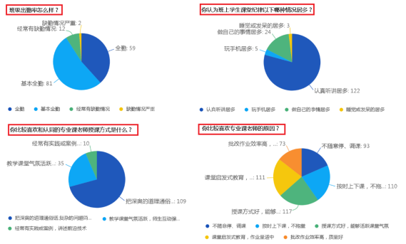 会前,支部书记项东升给学生下发了调查问卷,围绕学生学习情况、教师教学情况、学生对教学工作的建议等方面设计了20个问题,共收集了154份答卷,部分统计结果如下图。