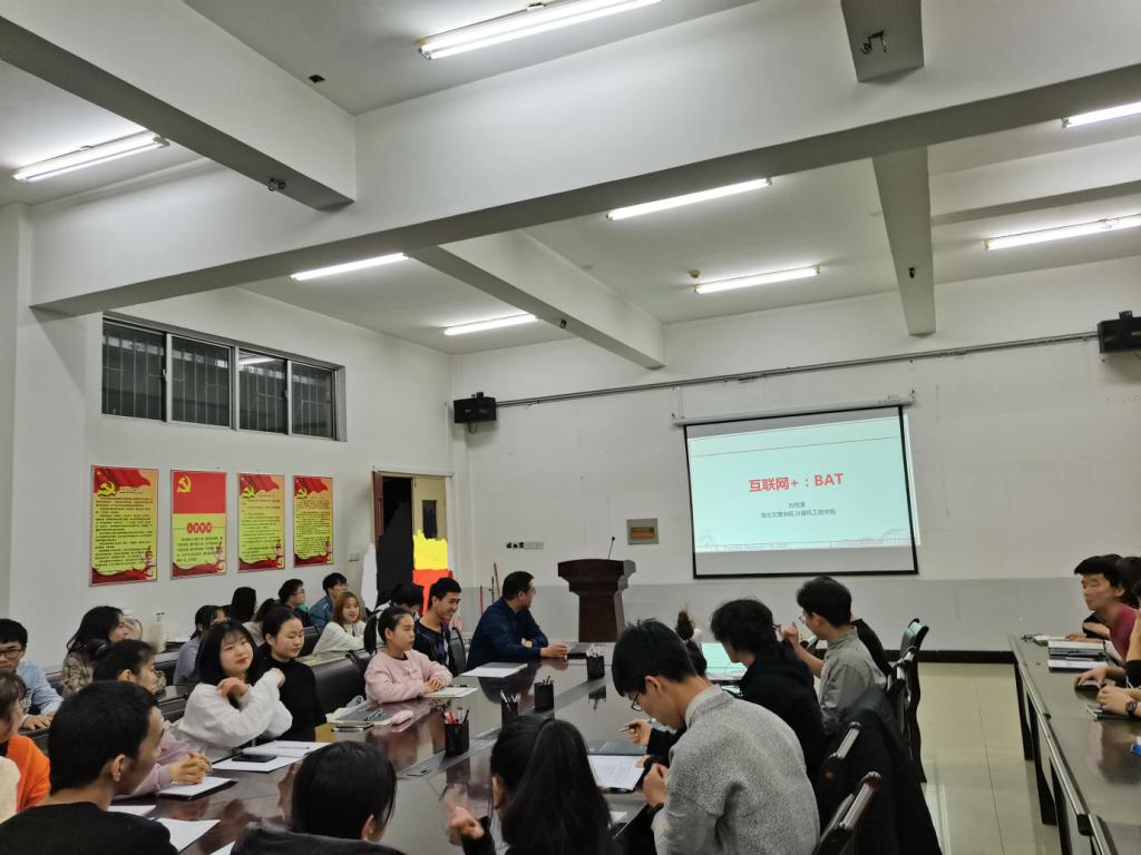 在北区5栋教学楼301会议室举办互联网+:BAT竞赛讲座,讲座由刘雨潇副教授主讲,各年级学生代表参加了讲座。