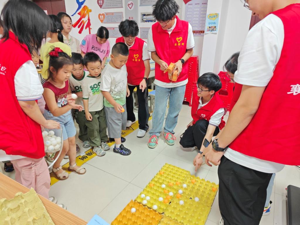 计算机学院“芯连心”志愿服务队开展“爱心接力,趣味乒乓”活动,吸引众多社区孩子参与其中。