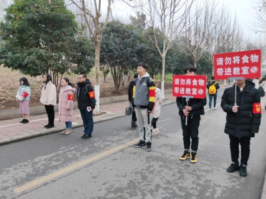 的学生党员、预备党员以及学生党总支成员按照排好的值班表准时到达金色食堂口进行文明监督。志愿者们用得体的言行制止同学们将食物带入教学区域,从而营造良好的学习环境,减少打扫卫生的工作人员的工作量。尽管天气严寒,不时有小雨落下,志愿者们仍坚守岗位,发挥党员的带头作用,为营造良好的校园环境做出自己的贡献。