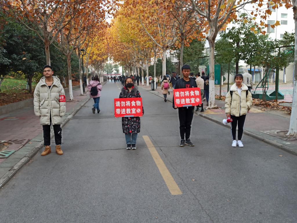 这一周每天早上7:50—8:10,值班人员准时到达值班地点,提醒督促同学们不要将食物带进教学区域,营造良好的学习环境和学习氛围。