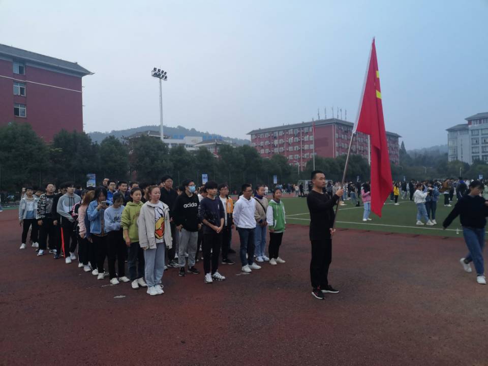 所有同学排成四列纵队,鲜红的党旗由旗手稳稳举起,在队伍正前方随风飘扬,一缕缕金色的阳光撒下,照耀在每位同学奔跑的身影上。整齐的步伐,矫健的身影,体现出同学们充满活力、青春洋溢的精神面貌。
