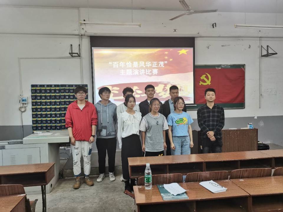 学生党支部于北区4栋401教室举办了“百年恰是风华正茂”主题演讲比赛。比赛由乔博春主持,辅导员张闪,学生党支部王顺祥、唐垚担任评委。