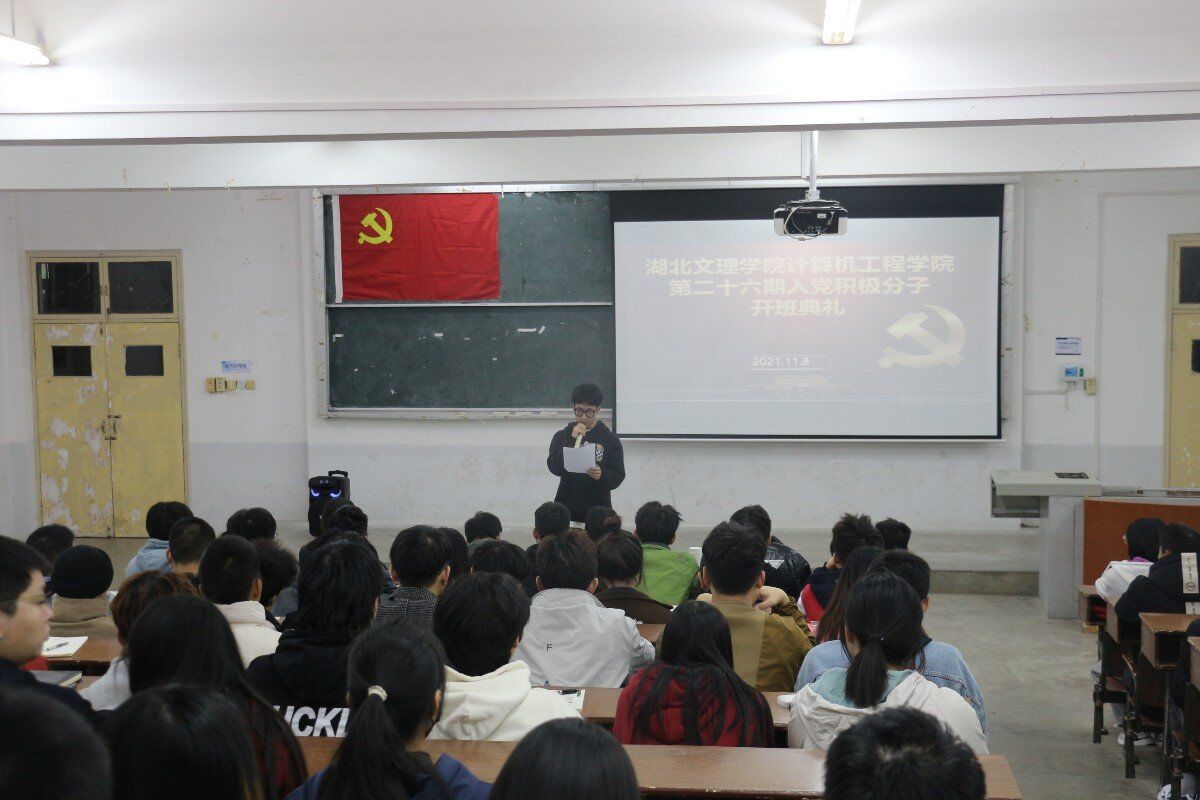 第二十六期入党积极分子培训班开班典礼在北区4栋JT04教室举行。院党委书记曹德勇、党委副书记李小华、辅导员毛小娟、秦文杰、张闪、童晓芳,全体学生党员,本期培训班学员以及学生党支部全体干部干事参加典礼。开班典礼由赵亚丽主持。