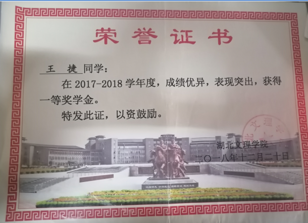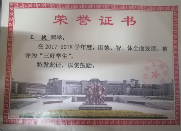 入校以来,王捷在专业学习中一直严格要求自己,努力提升自身的专业技术水平,连续两年学习成绩与综合素质均位列物联网专业第一。他积极参加学科竞赛,在2019年准备数学建模竞赛期间期间,他整个暑假都在实验室为竞赛做准备,在后来连续三天的比赛中,在全体组员以及老师的共同努力下,获得了省一等奖的好成绩。通过这次竞赛他认识到在学科竞赛取得优异的成绩离不开团队的交流合作及个人的顽强拼搏。