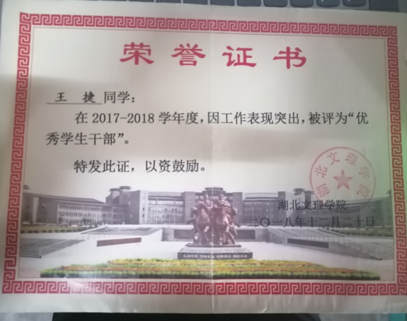 大一刚入学,王捷就参加了班委竞选。竞选学委成功后他下定决心,一定要尽己所能,服务好班级。担任学习委员期间,他积极完成老师布置的各种任务,从自身做起,促进班级良好学风的发展。由于当时班级人数较多,同学们对电脑使用不够熟练,导致交作业的格式经常出错,他就一份份的查验,不合要求,他就逐一联系同学们进行修改。虽然很累,但是在和同学以及老师的交流当中极大地提升了自身的沟通协调能力。大二期间,他主动担任《线性代数》课程的助教,帮助老师分担教学任务,批改作业,服务老师和全体同学。