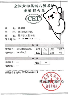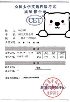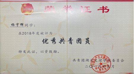 在平时的学习中,除了专业课程的学习,杨宇辉在大二上学期和大二下学期分别通过了四级和六级考试,在大二担任了计算机协会的副会长。