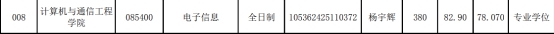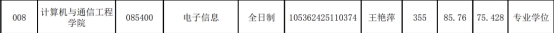 最终杨宇辉以政治73分,英语(二)77分,数学(二)119分,数据结构(850)111分,总分380分,总排名第10名,王艳萍以政治75分,英语(二)67分,数学(二)104分,数据结构(850)109分,总分355分,总排名第30名一起录取到长沙理工大学计算机与通信工程学院。