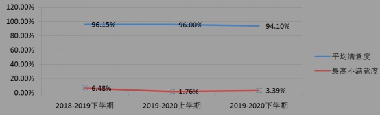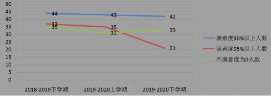 通过对比前二个学期和本学期学生评教的结果,发现平均满意度基本持平,略有下降,评价在满意度90%以上教师人数基本相当,在满意度95%以上教师人数下降较大,说明了学生对线上教学基本认同,但在教学效果方面相比之前略有下降。具体如下图。