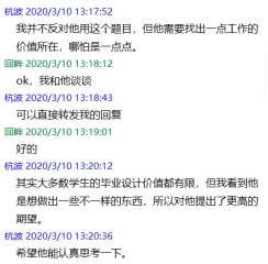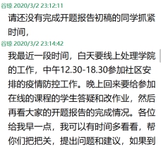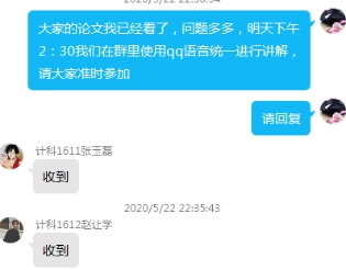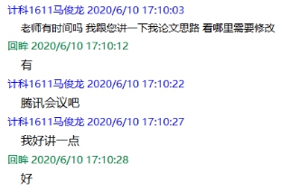 在疫情期间通过QQ、腾讯会议第一时间了解学生情况,与学生保持密切沟通,沟通疫情中学生的学习及生活情况,及时了解学生论文撰写过程中存在的问题、困难,以平等的民主探讨式态度,开展远程指导,及时给学生提供帮助。